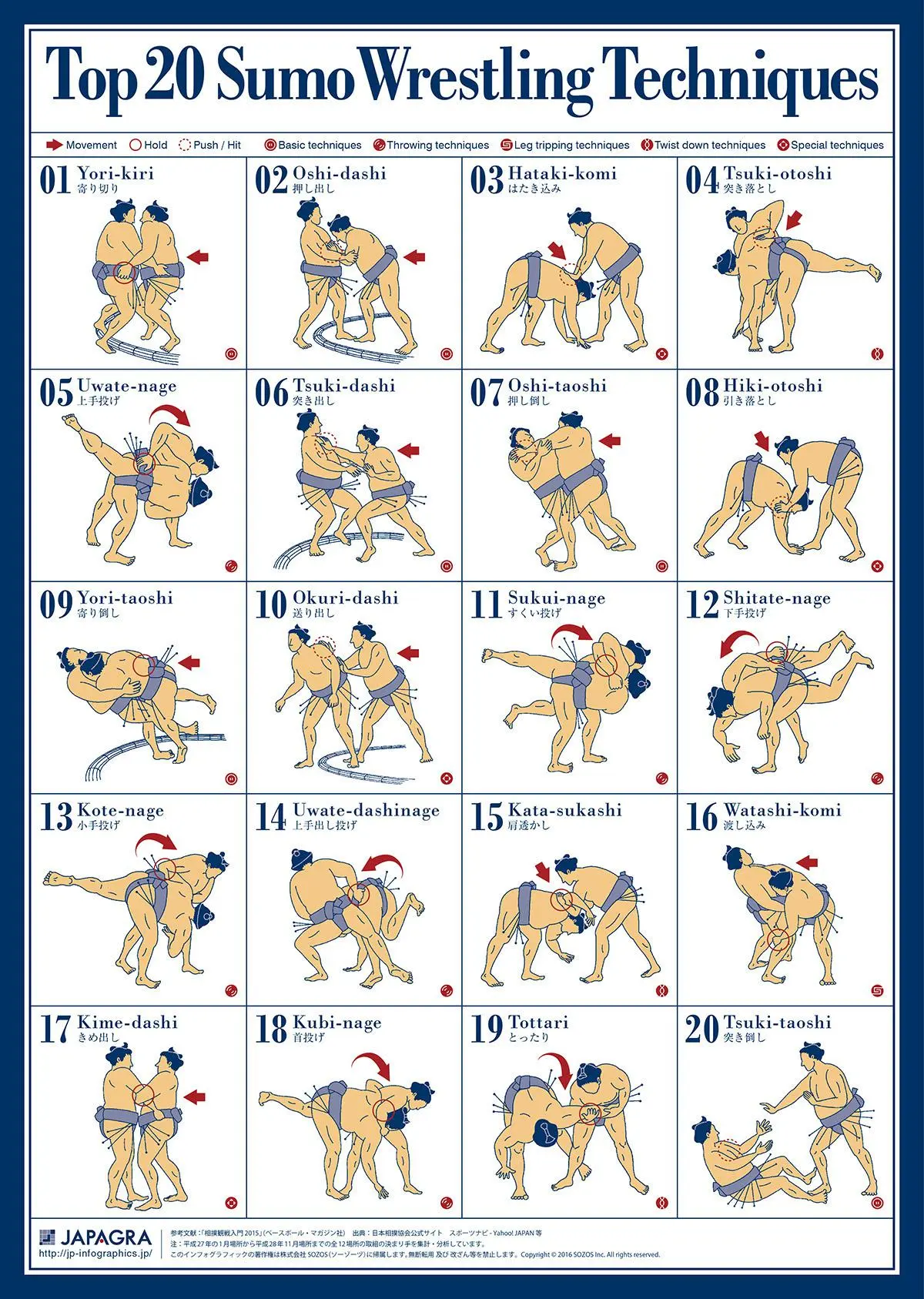 - Tsukidashi / Tsukiotoshi — thrusting techniques that push or topple the opponent.